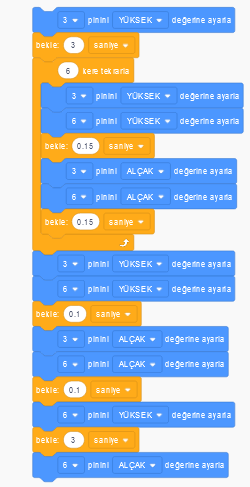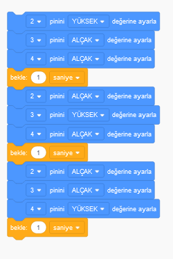 Belirli saniyeler aralığında ledlerimizi sırayla yakmamızı sağlayan devre şeması ve programı inceleyiniz.