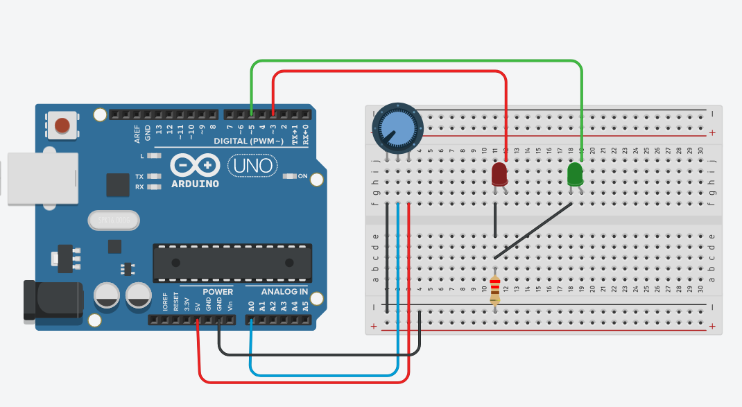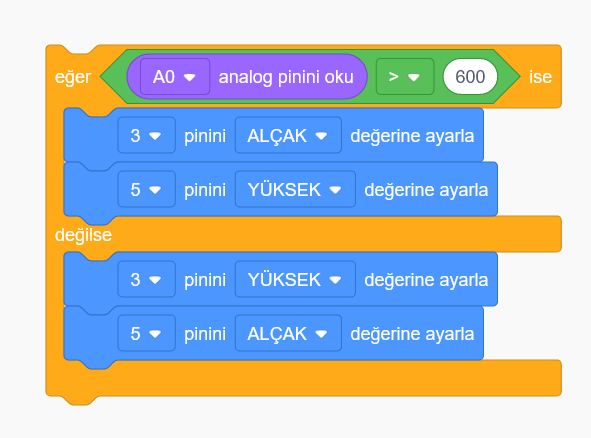 Potansiyometre 0 ile 1023 arasında değer alır, kurduğumuz devrede potansiyometrenin değeri 600den yüksek ise yeşil led değil ise kırmızı led yanacak şekilde programlanmıştır.