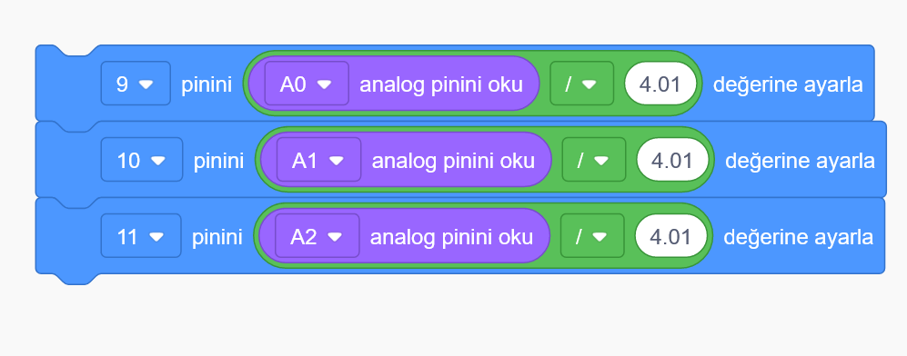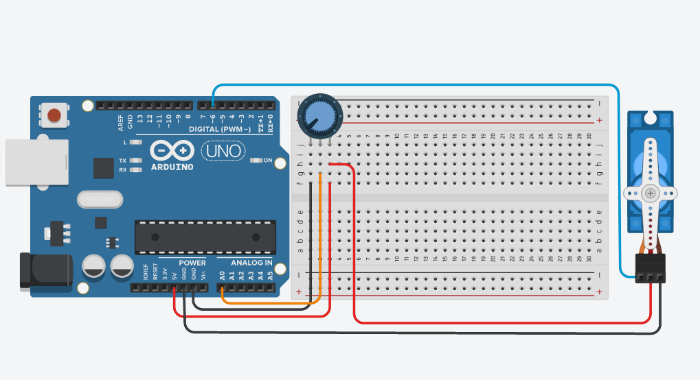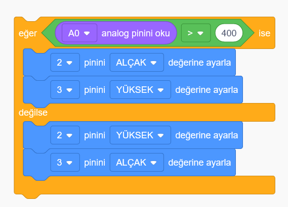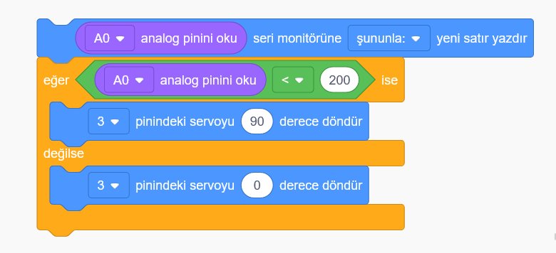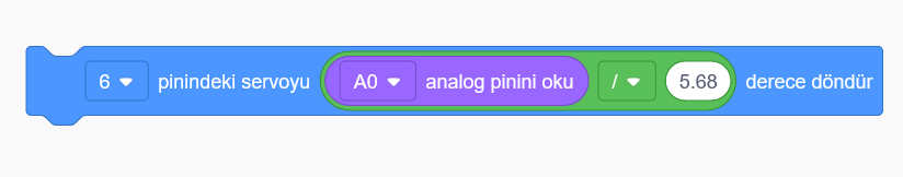 Analog girişler 0 le 1023 arası değer alır servo motor ise 0 ile 180 arasında basit bir matematik hesabi ile arasındaki farkın 5.68 olduğunu bulabiliriz. Bu şekilde her 5.68 değerde 1 derece servo motorumuzu döndürürsek tam hareketi sağlamış oluruz.