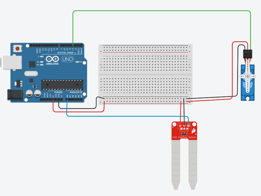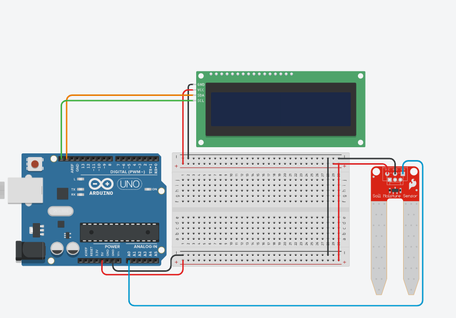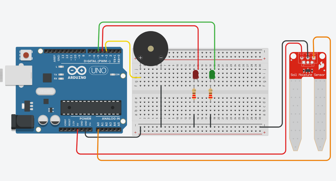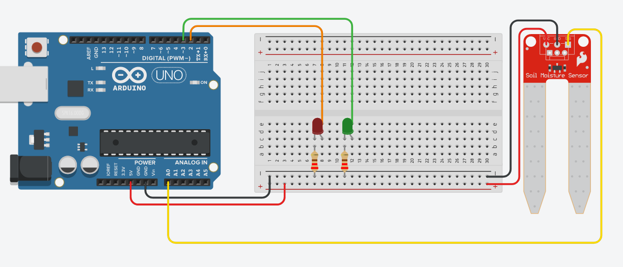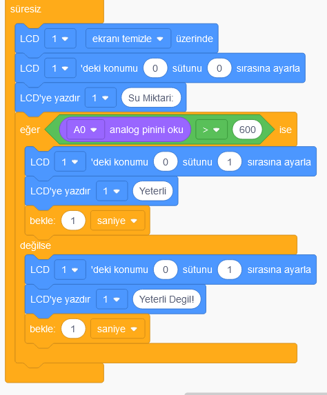 Toprak nem sensörü analog bir parça olduğu için değerleri 0 ile 1023 arasında olduğundan toprağın kuru değerini 400 altı olarak belirliyoruz. 400 değerinin üstünü ise yeşil yani yeterli neme sahip olarak belirleyip kodluyoruz.